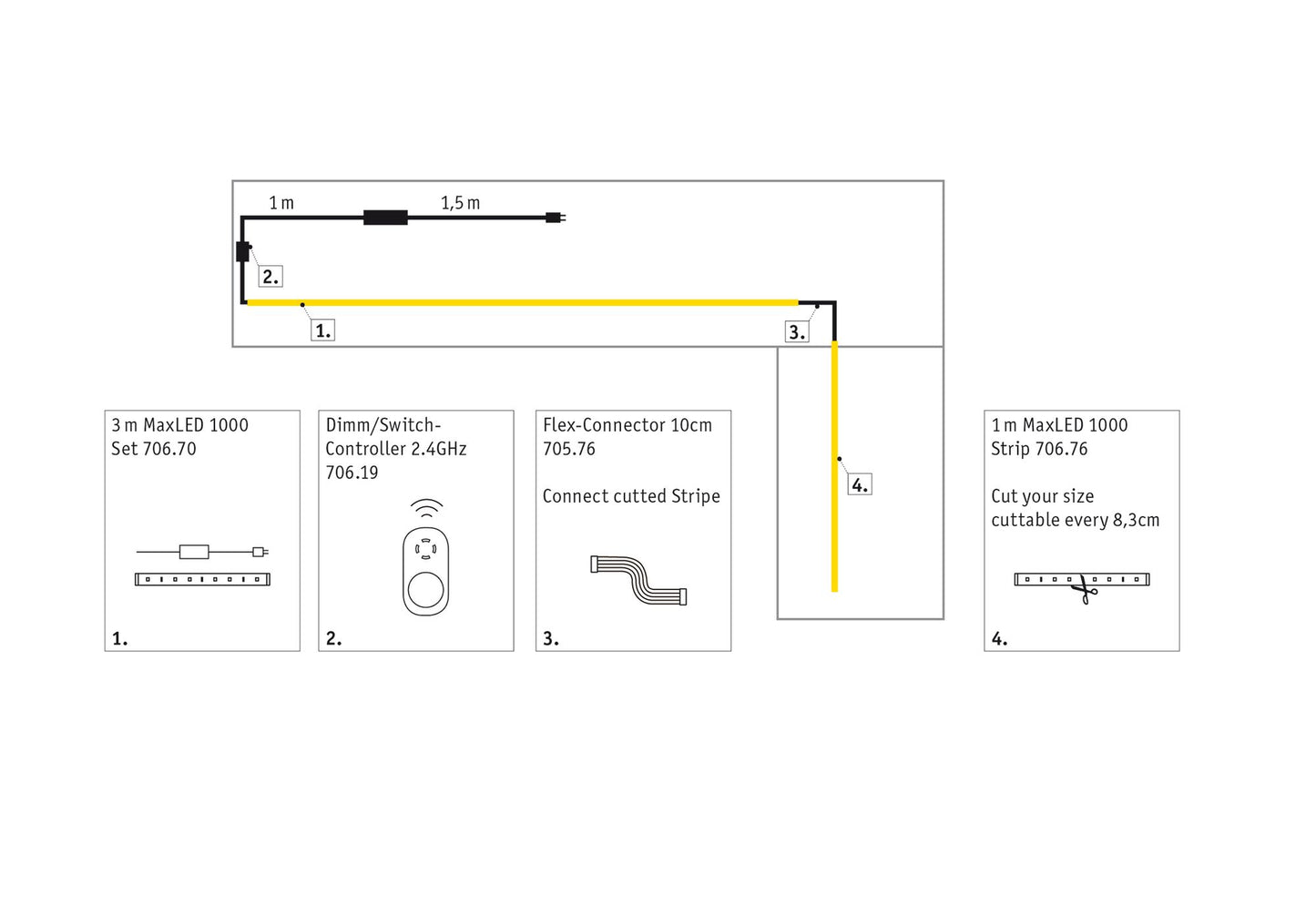 Das Function Bundle MaxLED 1000 Comf Set Küche Indirekt versetzt deinen Raum in die richtige Atmosphäre. Enthalten sind: ein Basisset MaxLED 1000, MaxLED X-Connector, SmartHome ZB MaxLED Schalt/Dimm Control 2x Function MaxLED Flex-Connector,Function MaxLED 1000 Strip. MaxLED-Strips sind so leistungsstark, dass sie problemlos zur Raumausleuchtung eingesetzt werden können. Warmweiße Strips sorgen für gemütliches und entspannendes Raum- und Nutzlicht. Das MaxLED Verbindungskabel dient zur Verlängerung oder Überbrückung von Distanzen. Das MaxLED Universal Connector Set beinhaltet alles, was Sie zum Verbinden von gekürzten und ungekürzten MaxLED-Strips benötigen.